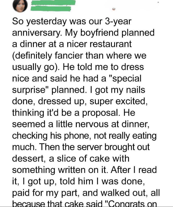 • You planned a romantic evening, perhaps a special dinner or a scenic outing, expecting a marriage proposal.